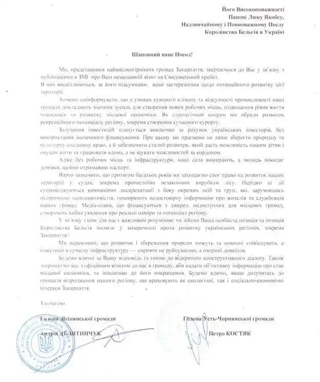 "Media attacks financed from sources unavailable to local communities create a false perception of the real intentions and potential of the region. In this regard, it is important for us to understand whether your personal position and the position of the Kingdom of Belgium is truly one of opposition to the development of Ukrainian regions, including Zakarpattia. We are convinced that development and nature conservation can and must coexist, and that investments in modern infrastructure should contribute not to destruction, but to the protection of the environment. We would be grateful for your response and remain ready for open and constructive dialogue. We also invite you to pay us an official visit in order to provide objective information about the state of the local economy and the initiatives for its improvement. We would appreciate your involvement in the processes of reviving our region, which takes into account both the ecological and socio-economic interests of Zakarpattia," the appeal to the Belgian Ambassador to Ukraine reads.